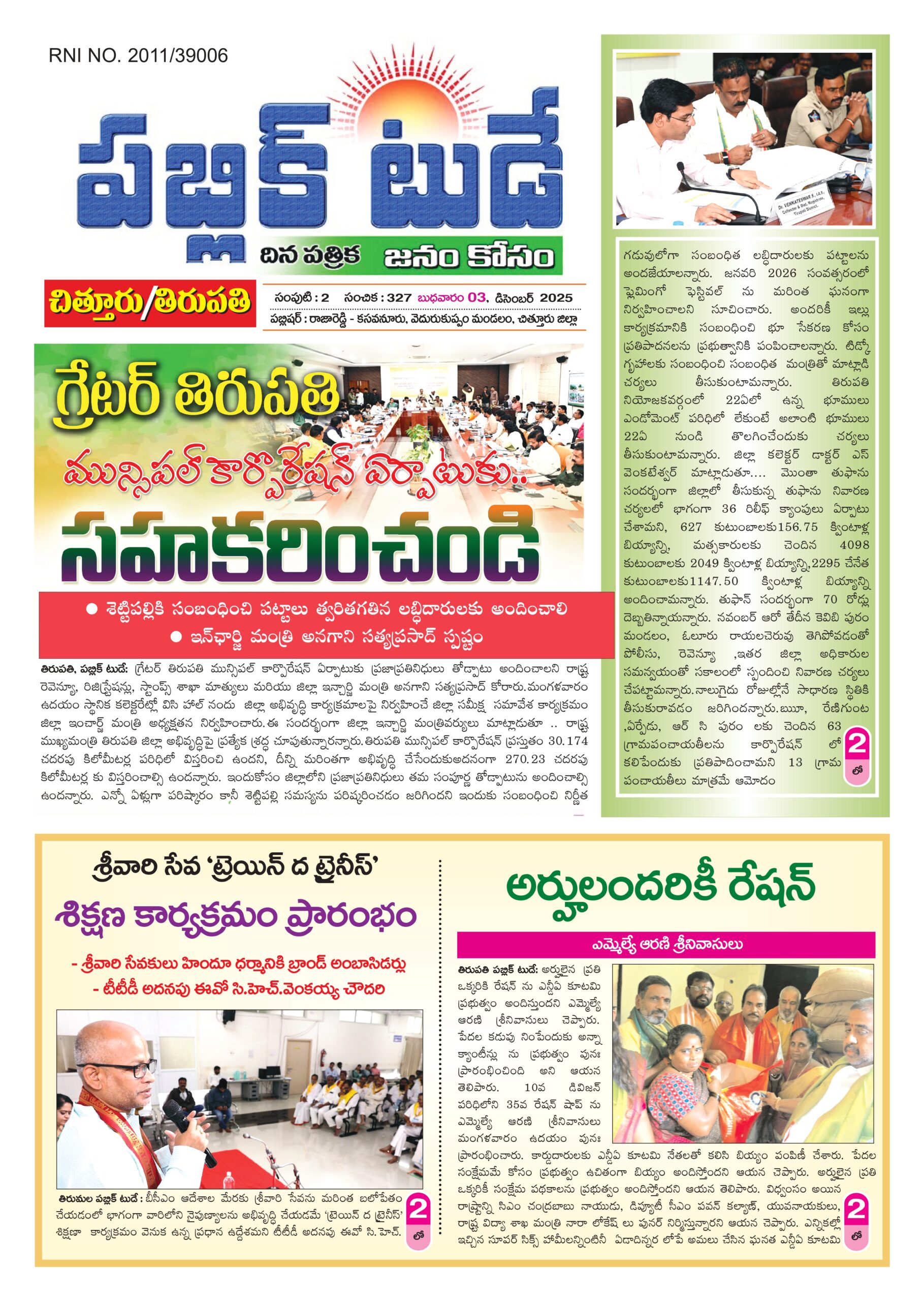 Tirupati Chittoor News Paper News Paper Tirupati chittoor Edition 03 december 2025 By Public Today - August 16, 2025 0 830 FacebookTwitterPinterestWhatsApp Select Date Download PDF Start Clipping Share Cancel Previous Page 0 of 0 Next × Open Download Facebook Twitter WhatsApp